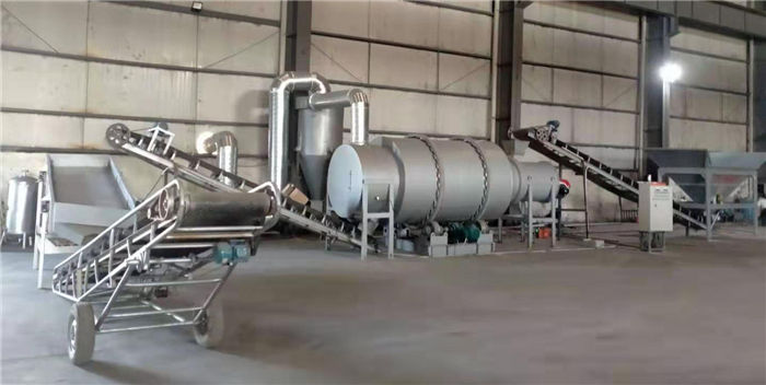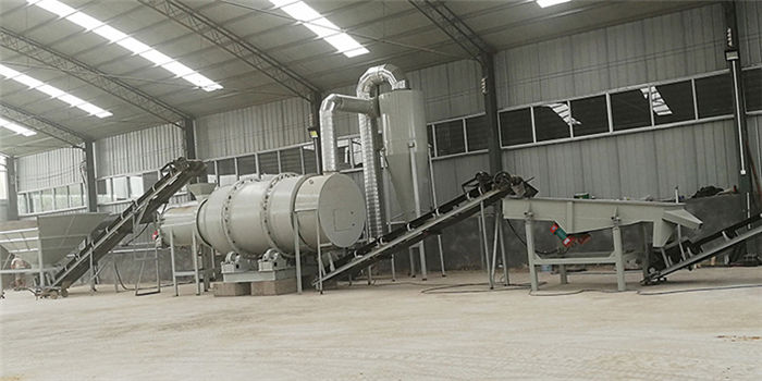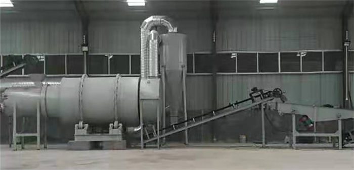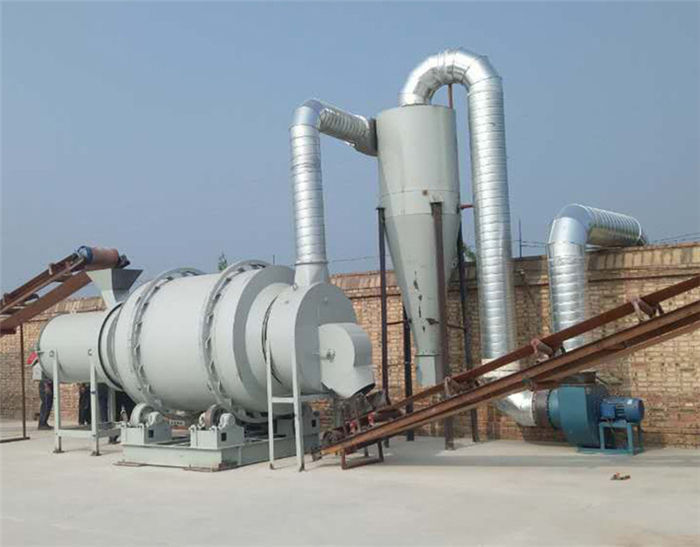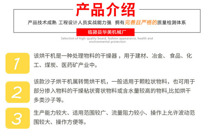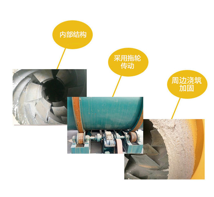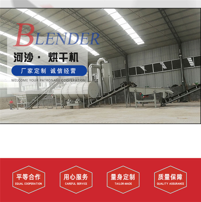 該烘干機工作原理:物料由供料裝置進入回轉滾筒的內層,實現順流烘干,物料在內層的抄板下不斷抄起、散落呈螺旋行進式實現熱交換,物料移動至內層的另一端進入中層,進行逆流烘干,物料在中層不斷地被反復揚進,呈進兩步退一步的行進方式,物料在中層既吸收內層滾筒散發的熱量,又吸收中層滾筒的熱量,同時又延長了干燥時間,物料在此達到干燥狀態。物料行至中層另一端而落入外層,物料在外層滾筒內呈矩形多回路方式行進,達到干燥效果的物料在熱風作用下行進排出滾筒,沒有達到干燥效果的濕物料因自重而不能快速行進,物料在此矩形抄板內進行充分干燥,由此完成干燥目的。