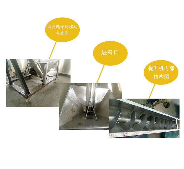 螺旋提升機產品概述該機適用于食品、醫藥、化工、塑料等行業的粉粒狀物料的輸送。可以與我司包裝機配套實現料位跟蹤自動供料,也可單獨在其它場合使用。除電機、軸承、機架外其余為不銹鋼制成。可隨意移動,在水平、傾斜、垂直等位置均能連續輸送,它具有良好的密封性,無粉塵泄漏。可直接與其配套的設備連接固定,不需要地基基礎,充分利用廠房空間。